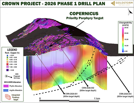 Ken Konkin, P. Geo., President and CEO, stated: “We are pleased to announce the first five proposed drill holes of Phase 1 at the Crown Project. We plan to launch the first set of three HQ and NQ2 drill holes targeting the Copernicus and Orion Spine Porphyry targets as our highest priority (see Figure 1). The holes may be drilled to depths of as much as 800 m to test the extent of the IP chargeability anomalies, and will be wide-spaced in order to fast-track the strongest looking mineralized areas (see Figure 2). In addition to drilling at Orion Spine, we plan to drill the Delta West target, discovered by our reconnaissance crew last season, where a grab sample yielded over 39 g/t gold from a shear hosted quartz vein containing fine-grained pyrite. As well, samples from numerous sub-parallel structures over a 500 m x 800 m gossanous area returned significant gold values. Delta West is located ten kilometers directly south of the Valley of the Kings Gold Deposit at the Brucejack Mine. All proposed drill holes have been plotted on various types of enhanced images that highlight the IP chargeability and geological interpretations completed by our field crews. We have utilized high-resolution WorldView-3 Multispectral Images obtained at the end of the 2025 field season that demonstrate various types of alteration and iron oxidation associated with various styles of mineralization and their associated alteration assemblages (Figure 3). These images have greatly enhanced our geological interpretations and aided in drill targeting. The re-interpretation of all geophysical data also supports the ‘Thrust Fault Model’ extending southward beyond the Treaty Creek and KSM Deposit models as shown in the cross section below (Figure 2).”